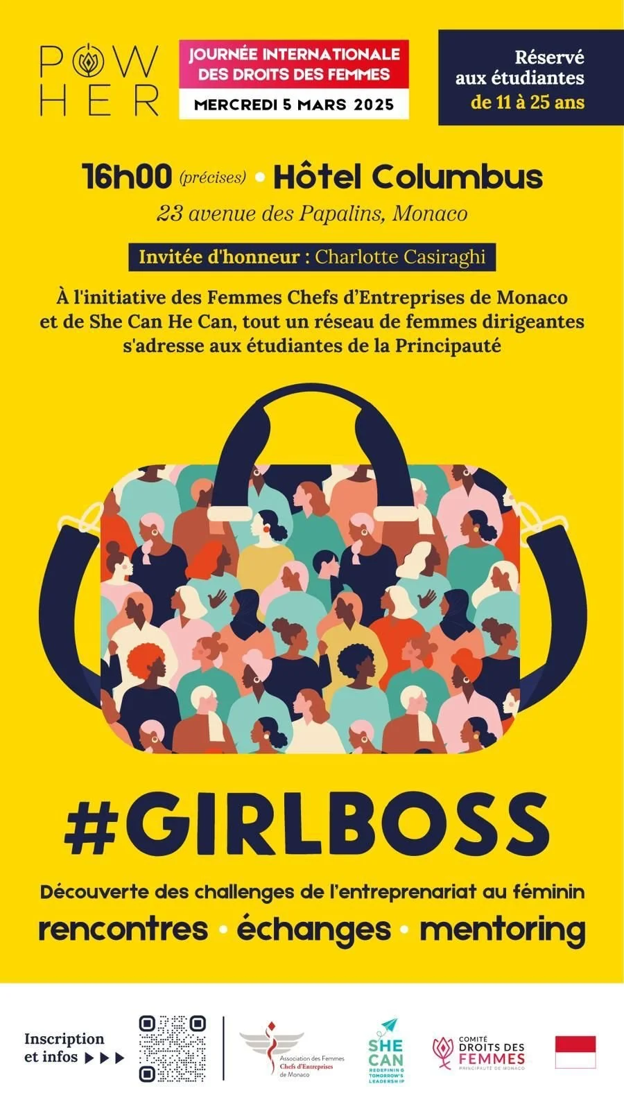 Retour à tous les événements Girl Boss 5e édition mercredi 5 mars 2025 16:00 18:45 Hôtel Columbus 23 Avenue des Papalins Monaco, 98000 Monaco (carte) Google Agenda ICS En collaboration avec SheCanHeCan , venez inspirer les jeunes étudiantes, lycéennes et collégiennes dans cette séance annuelle de mentoring par des cheffes dirigeantes du privé et du public auprès de jeunes filles de Monaco et de la région.