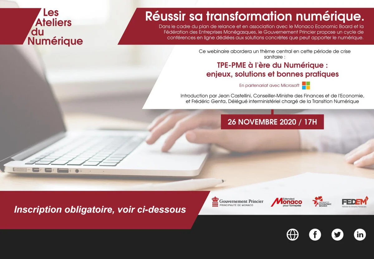 Cette conférence sera introduite par Jean Castellini, Conseiller-Ministre des Finances et de l’Economie et Frédéric Genta, Délégué Interministériel chargé de la Transition Numérique, qui détailleront le Fonds Bleu, dispositif d’aide financière du Gouvernement qui vise à soutenir les entreprises dans cette démarche.